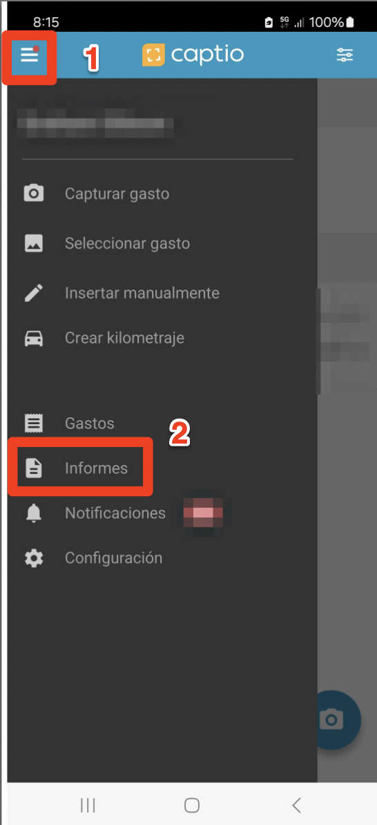 - Abra la app de Captio en su dispositivo, luego acceda a la sección de informes tocando el ícono del menú de tres líneas ubicado en la esquina superior izquierda de la interfaz de la app.