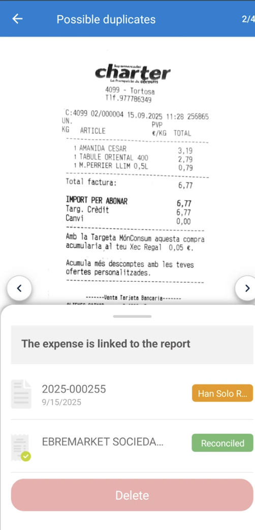 Passo 3. Rever a despesa duplicada e selecionar qual se deseja eliminar. Com as setas (direita / esquerda) podemos passar para ver o recibo que foi detetado como possível duplicado. No caso de o recibo já estar dentro de um relatório, desde que o relatório esteja em rascunho, poderá decidir qual despesa eliminar.